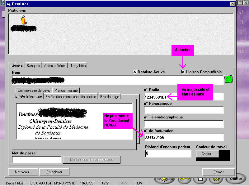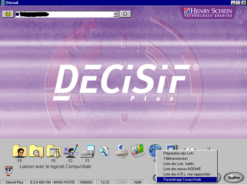 - Vérifier auprès du praticien la version de sont logiciel Décisif (Minimum 6.3.4) et la disponibilité du CDRom 6.3.4 (Attention lors de la mise à jour de Décisif à l'horaire pour demander le code de passage à la nouvelle version